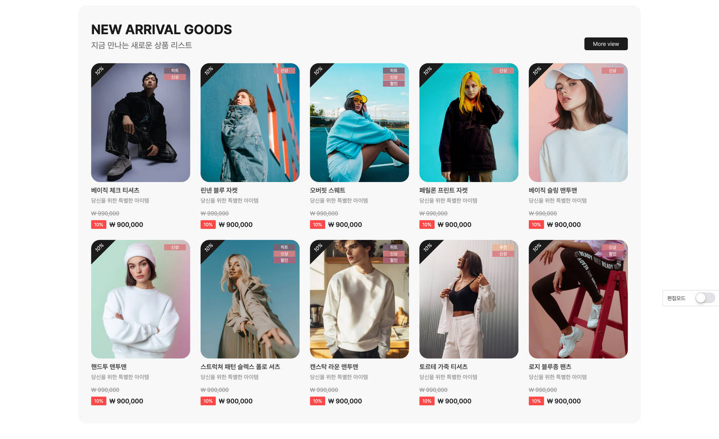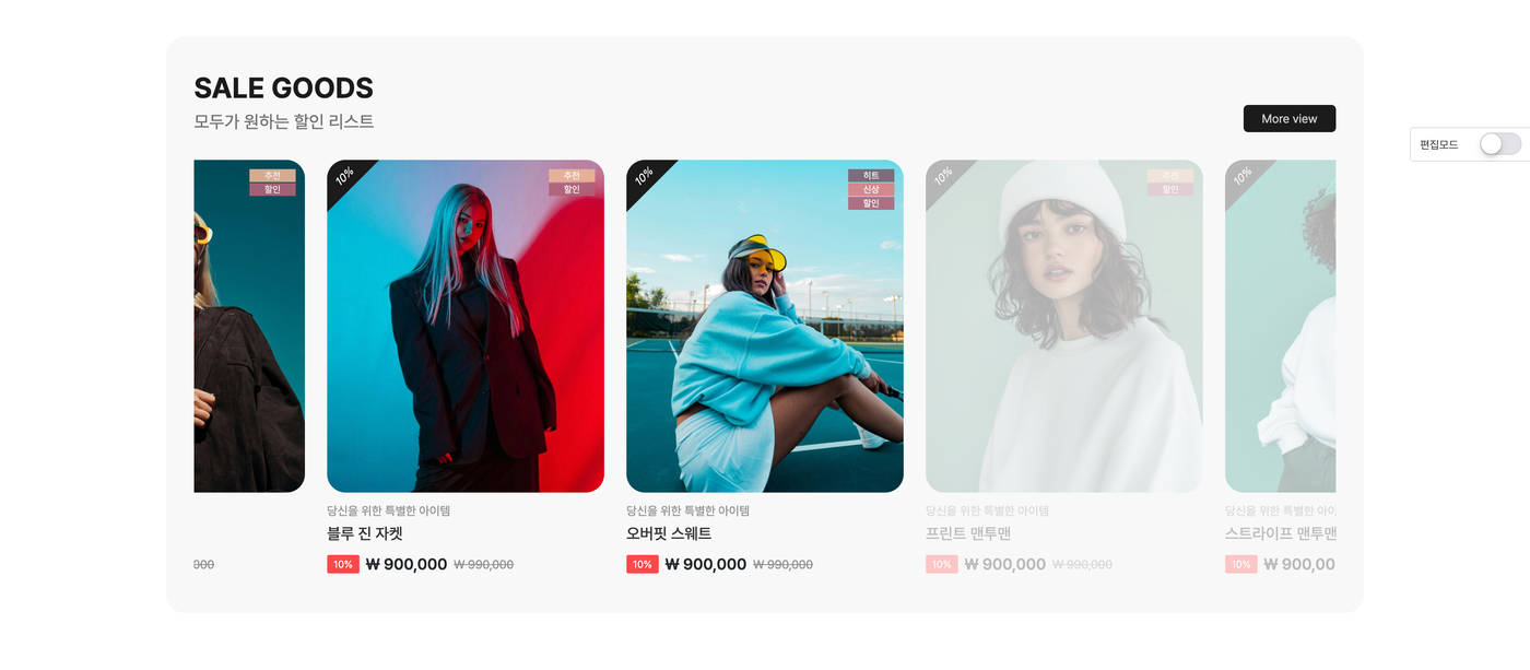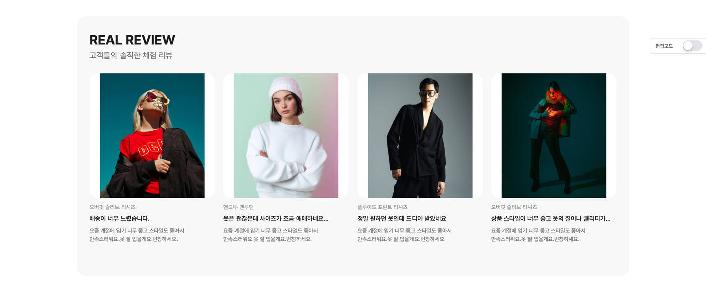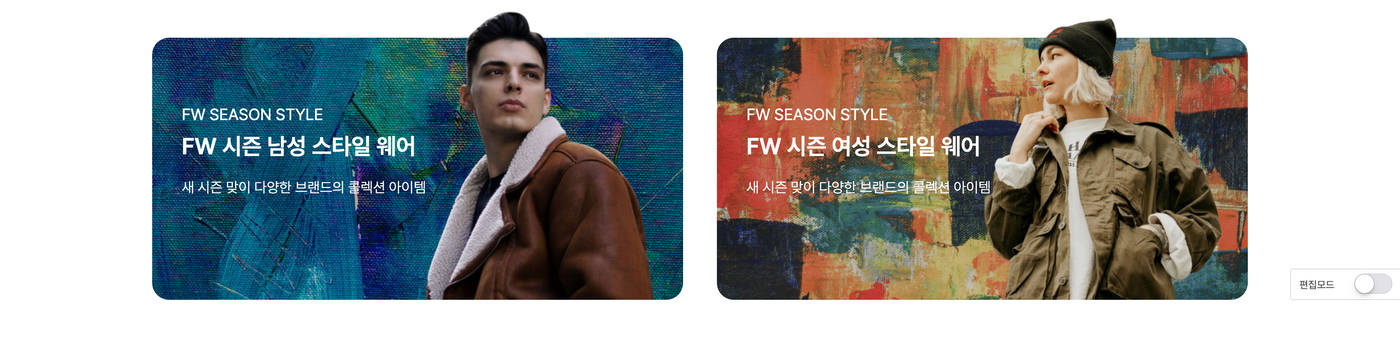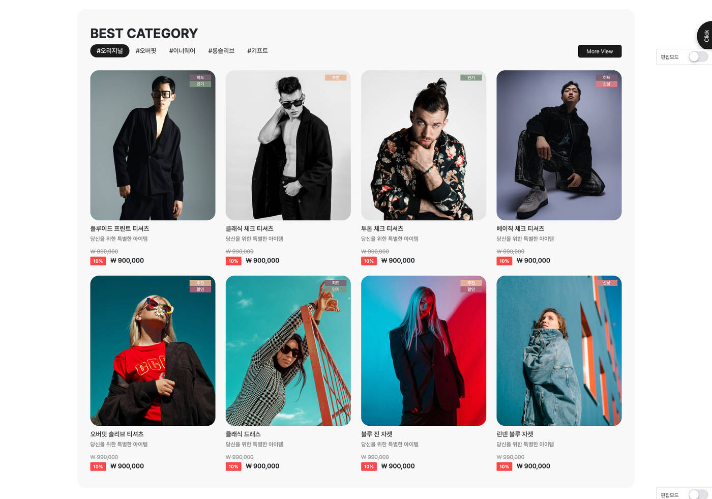 - 메인에서 편집모드를 통해 내용 및 이미지 수정이 가능하며 상품 등록 후에도 개별상품 설정이 가능합니다.