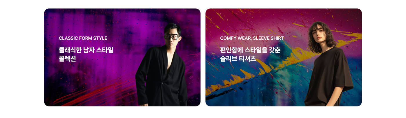 - · 이미지 비율 #1(전면) : 450x580 픽셀 png / #2(배경) : 10000x667 픽셀 이미지 사용.